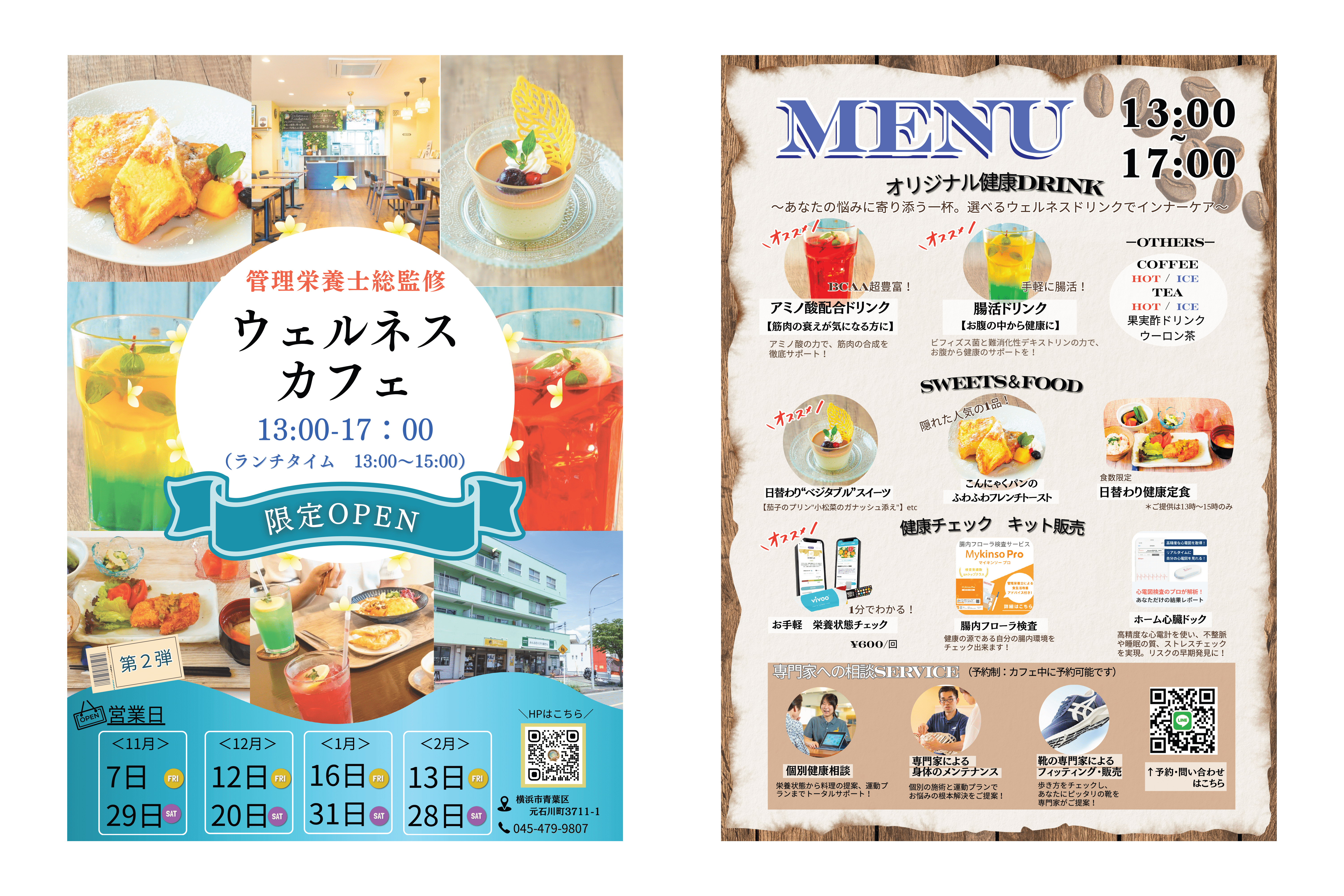 ヘルスケアカフェを新規開店しました!管理栄養士特製の栄養満点ランチ(限定10食)や、各種ドリンク、デザート、健康に関する体験ブースもご用意しています!